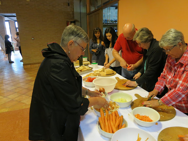 Here I am peeling garlic and others are chopping carrots and tomatoes and preparing the bread.